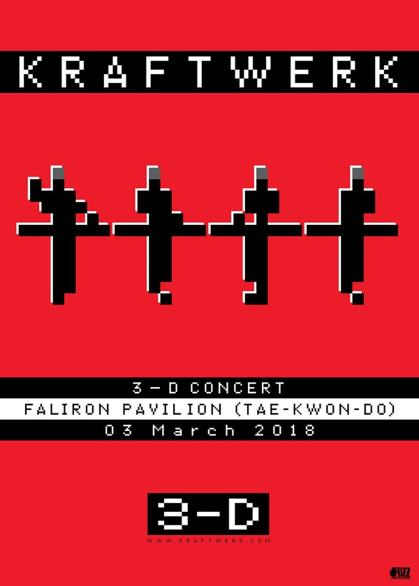 Οι Kraftwerk, ένα από τα σημαντικότερα και επιδραστικότερα σύνολα στην ιστορία της σύγχρονης μουσικής, έρχονται στην Αθήνα! Οι Γερμανοί πρωτοπόροι της ηλεκτρονικής σκηνής θα εμφανιστούν στο Κλειστό Παλαιού Φαλήρου (Tae Kwon Do), το Σάββατο 3 Μαρτίου 2018, στο πλαίσιο της 3-D Concerts περιοδείας τους, η οποία έχει γνωρίσει τεράστια επιτυχία σε ολόκληρο τον κόσμο, συνδυάζοντας μουσική και εικόνα σε ένα οπτικοακουστικό show που χαρακτηρίστηκε ως "απόλυτο έργο τέχνης."
